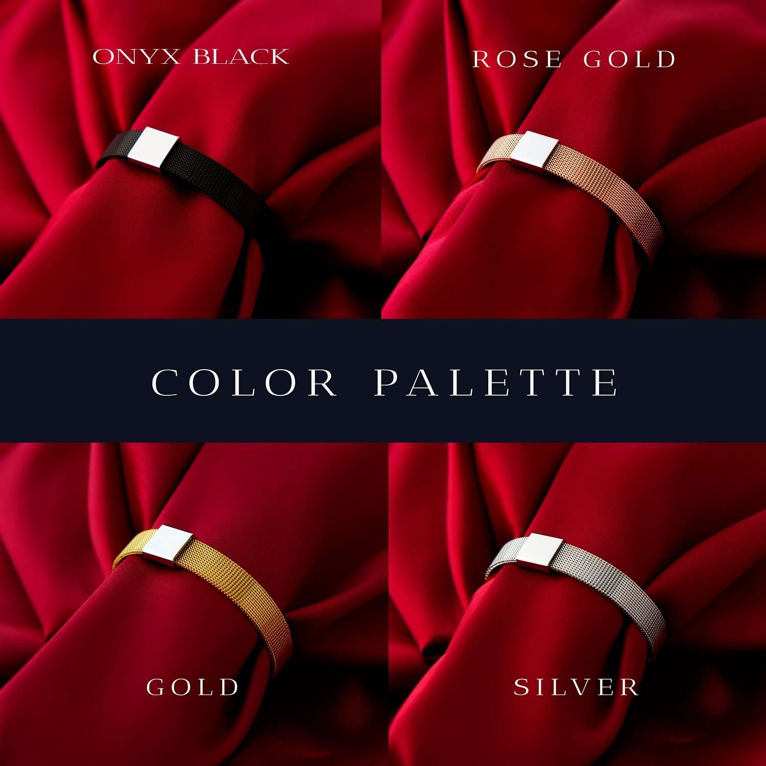 ▸ Armbandets ytbehandling: 18K guldpläterad, 18K roséguldpläterad, svart PVD-pläterad eller spegelpolerat rostfritt stål